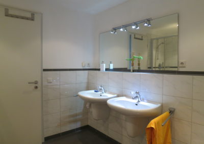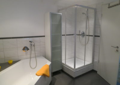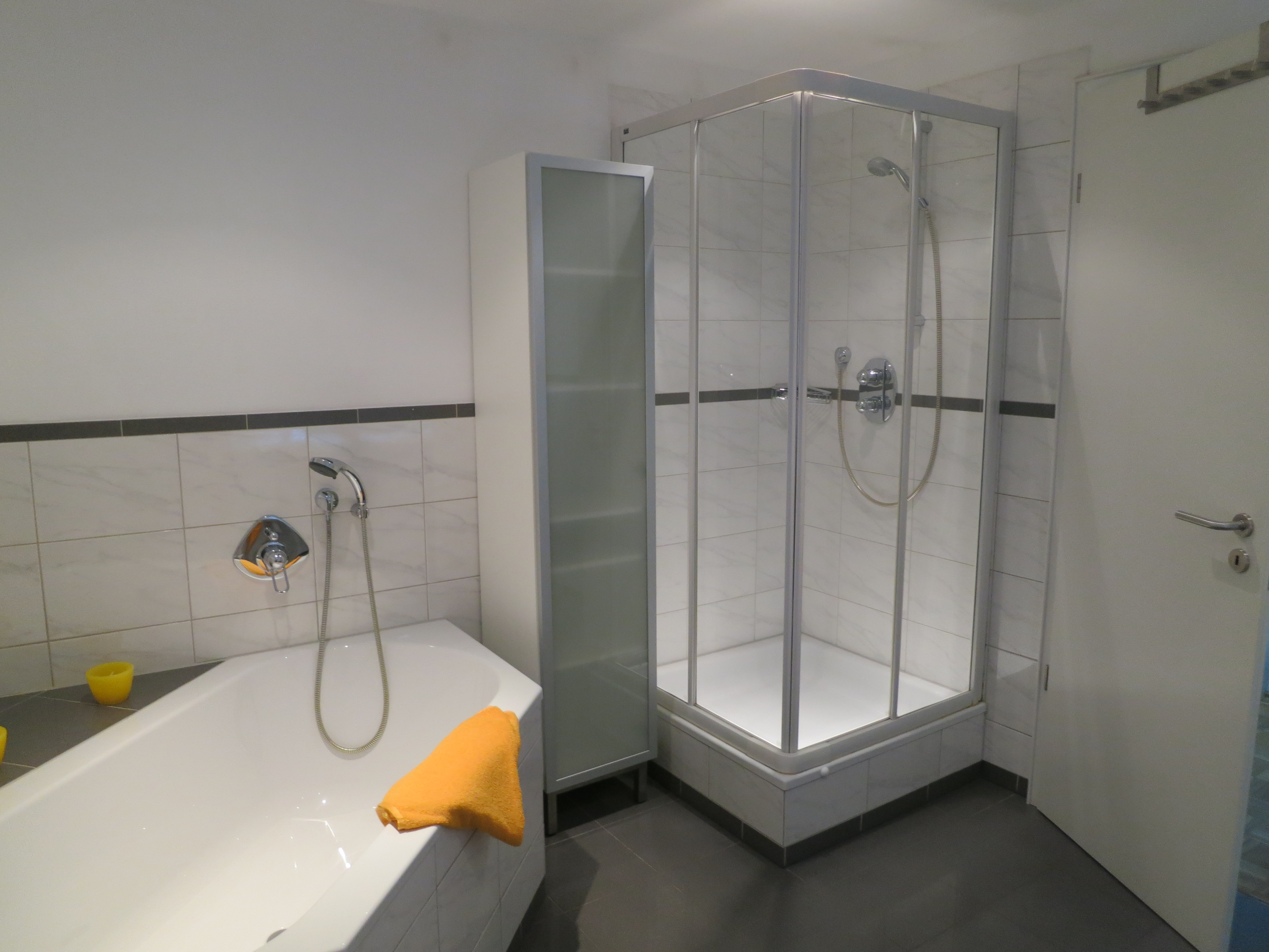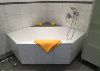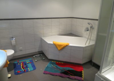 zum vergrößern anklicken Badewanne Doppelwaschbeckengroßer Spiegel mit Beleuchtung Eckbadewannerechts Schrank & Dusche DuscheBadschrank, links Badewanne Blick von Eingangstür Blick von der Diele in Bad